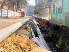 ড্রেন খননের সময় দোয়েল সরকারি প্রাথমিক বিদ্যালয়ের সীমানার প্রাচীর ভেঙে পরল