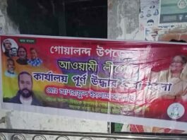 গোয়ালন্দ উপজেলা আওয়ামী লীগ কার্যালয়ে পুনরুদ্ধারের ব্যানার
