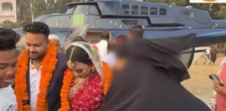 নাসিরনগরে স্ত্রীর ইচ্ছে পূরণে হেলিকপ্টারে বাড়ি ফিরলেন বর বউ