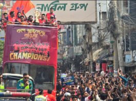 বিপিএল চ্যাম্পিয়ন রাজশাহী ওয়ারিয়র্সকে ছাদখোলা বাসে সংবর্ধনা