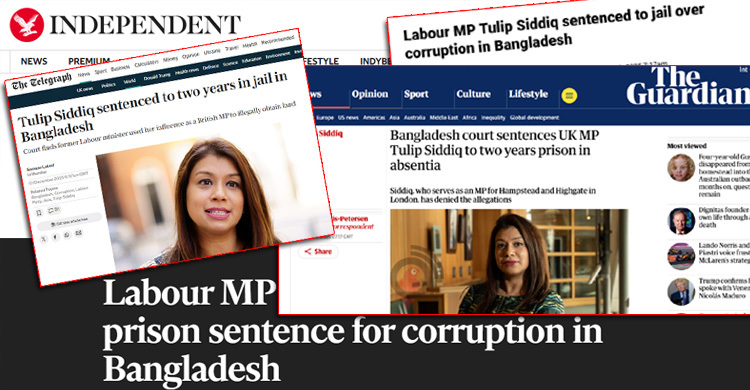 দ্য টেলিগ্রাফ লিখেছে, ‘Tulip Siddiq jailed for two years over corruption in Bangladesh’ (বাংলাদেশে দুর্নীতির অভিযোগে টিউলিপ সিদ্দিককে দুই বছরের কারাদণ্ড)।