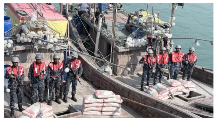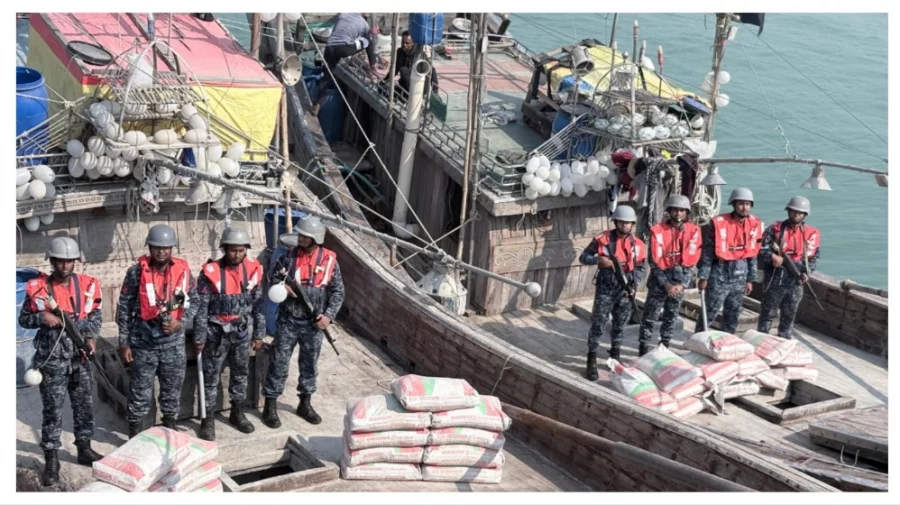এ সময় টহলে নিয়োজিত থাকা বাংলাদেশ নৌবাহিনী জাহাজ শহীদ মহিবুলাহ কুতুবদিয়া বাতিঘর হতে ৪৬ মাইল দূরে সন্দেহজনক দুটি কাঠের বোট দেখতে পায়। নৌবাহিনী জাহাজ বোট দু’টিকে থামার সংকেত দিলে তারা পালানোর চেষ্টা করে। নৌবাহিনী জাহাজ মহিবুল্লাহ ধাওয়া করে ‘এফবি আজিজুল হক’ এবং ‘এফবি রুনা আক্তার’ নামক দুইটি বোট আটক করে। আটককৃত বোটগুলো তল্লাশি করে ১ হাজার ৭৫০ বস্তা বাংলাদেশি ডায়মন্ড সিমেন্ট এবং ৩২ টি মোবাইল জব্দ করা হয় ।