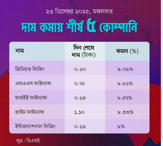 আজ (২৩ ডিসেম্বর, ২০২৫) ঢাকা স্টক এক্সচেঞ্জে (ডিএসই) শেয়ারের দাম কমার তালিকায় শীর্ষস্থানে রয়েছে প্রিমিয়ার লিজিং অ্যান্ড ইনভেস্টমেন্ট লিমিটেড। কোম্পানিটির শেয়ারের দর আজ সবচেয়ে বেশি হ্রাস পেয়েছে।