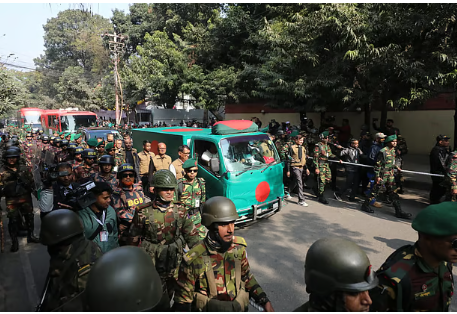 বিএনপি চেয়ারপারসন ও সাবেক প্রধানমন্ত্রী খালেদা জিয়ার মরদেহ জাতীয় পতাকায় মোড়ানো একটি গাড়িতে করে গুলশান থেকে জানাজার জন্য মানিক মিয়া অ্যাভিনিউয়ে নেওয়া হচ্ছে।