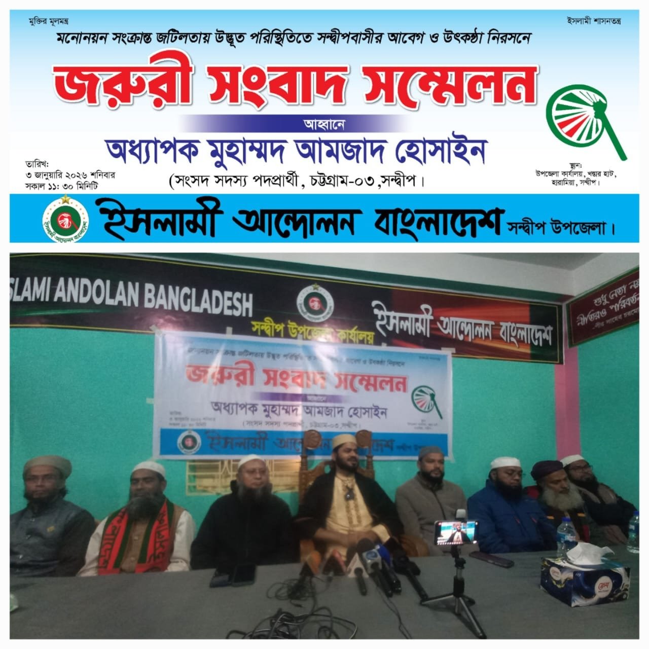 বাংলাদেশ জাতীয় সংসদের সংসদীয় আসন–২৮০, চট্টগ্রাম–৩ (সন্দ্বীপ) আসনে ইসলামী আন্দোলন বাংলাদেশের দলীয় প্রার্থী মুহাম্মদ আমজাদ হোসেনের মনোনয়নপত্র গতকাল চট্টগ্রাম জেলা প্রশাসকের কার্যালয়ে রিটার্নিং অফিসার কর্তৃক অবৈধ বা বাতিল ঘোষণার প্রতিবাদে আজ ০৩/০১/২০২৬ ইং রোজ- শনিবার, সন্দ্বীপ উপজেলার দলীয় কার্যালয়ে এক জরুরি সংবাদ সম্মেলনের আয়োজন করা হয়।