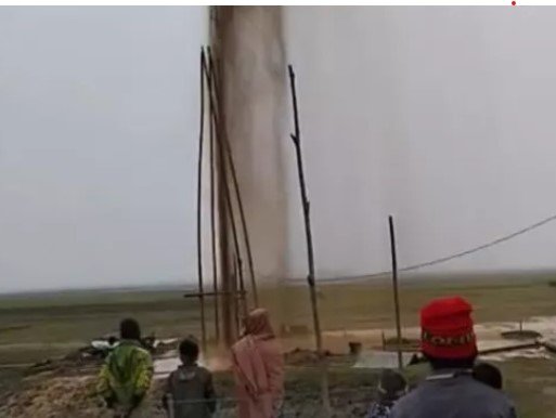 জানা যায়, নিজেদের জমিতে পানি সেচ দেওয়ার জন্য রায়পুর গ্রামের আমিরুল ইসলামের ছেলে কৃষক মো. আলমগীর গত শুক্রবার থেকে মিস্ত্রি দিয়ে সেচ পাম্প বসানো কাজ শুরু করেন। ওইদিনই ২৫০ ফুট গভীরে পাইপ বসানো হয়। শনিবার সকাল ৮টার দিকে মিস্ত্রি পাইপের ভেতরে মটর দিয়ে পানি তোলার কাজ শুরু করলে ভেতর থেকে বালু মিশ্রিত পানিসহ পাইপ ও মটর ধীরে ধীরে উপরে উঠে আসে। সময় যাওয়ার সাথে সাথে পরে প্রবল বেগে বালু মিশ্রিত পানি বের হতে থাকে। ঘটনা জানাজানি হলে স্থানীয়রা সেখানে ভিড় জমায় এবং তাদের মাঝে আতঙ্ক ছড়িয়ে পড়ে। দুপুর ১২টার দিকে গ্যাসের চাপ কমে স্বাভাবিক অবস্থায় ফিরে আসে।