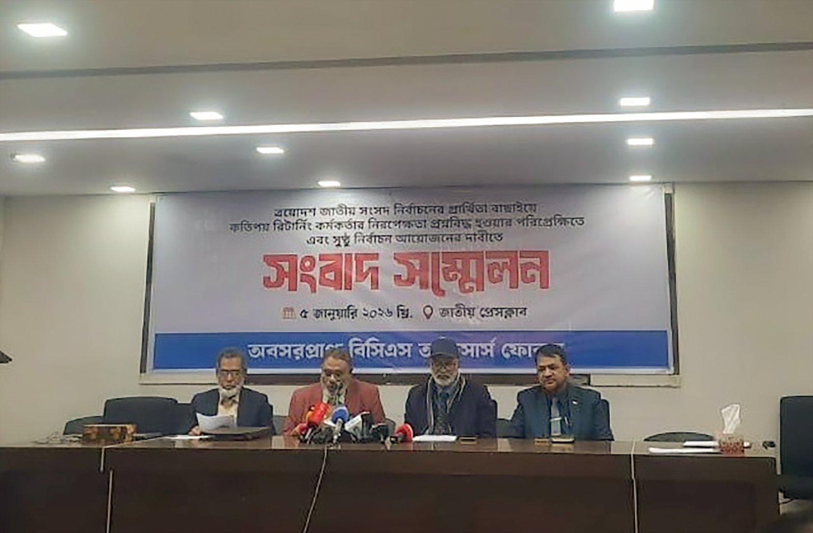 সোমবার (৫ জানুয়ারি) সকালে জাতীয় প্রেসক্লাবের জহুর হোসেন চৌধুরী হলে আয়োজিত এক জরুরি সংবাদ সম্মেলনে এসব কথা বলেন সংগঠনের নেতৃবৃন্দ। প্রার্থিতা বাছাইয়ে কতিপয় রিটার্নিং কর্মকর্তার প্রশ্নবিদ্ধ ভূমিকা এবং সুষ্ঠু নির্বাচনের পরিবেশ নিশ্চিতের দাবিতে এই সংবাদ সম্মেলন অনুষ্ঠিত হয়।