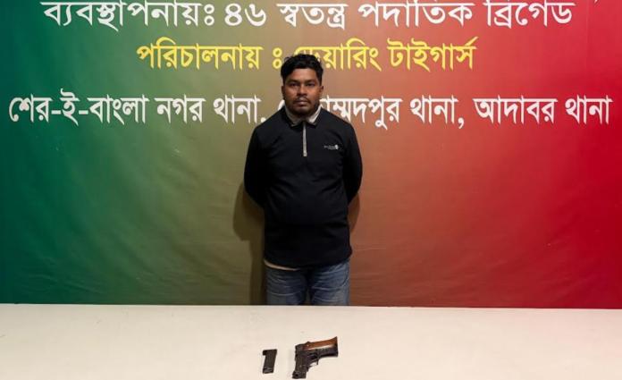 রাজধানীর মোহাম্মদপুরের রায়েরবাজার এলাকায় অভিযান চালিয়ে বেলজিয়ামের তৈরি একটি অত্যাধুনিক বিদেশি পিস্তল ও ম্যাগাজিনসহ রিয়াজ (৩৫) নামে এক অস্ত্রধারীকে গ্রেপ্তার করেছে সেনাবাহিনী। মঙ্গলবার (৬ জানুয়ারি) ৪৬ স্বতন্ত্র পদাতিক ব্রিগেডের পক্ষ থেকে এই তথ্য নিশ্চিত করা হয়েছে।