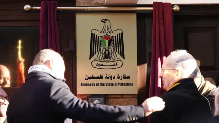 যুক্তরাজ্যে আনুষ্ঠানিকভাবে যাত্রা শুরু করলো ফিলিস্তিন রাষ্ট্রের দূতাবাস। সোমবার (৫ জানুয়ারি) পশ্চিম লন্ডনের হ্যামারস্মিথে অবস্থিত এই দূতাবাসের উদ্বোধনী অনুষ্ঠানকে ‘ঐতিহাসিক মুহূর্ত’ এবং ব্রিটিশ-ফিলিস্তিনি সম্পর্কের ক্ষেত্রে একটি ‘গভীর তাৎপর্যপূর্ণ মাইলফলক’ হিসেবে বর্ণনা করেছেন দেশটিতে নিযুক্ত ফিলিস্তিনের রাষ্ট্রদূত হুসাম জোমলট।