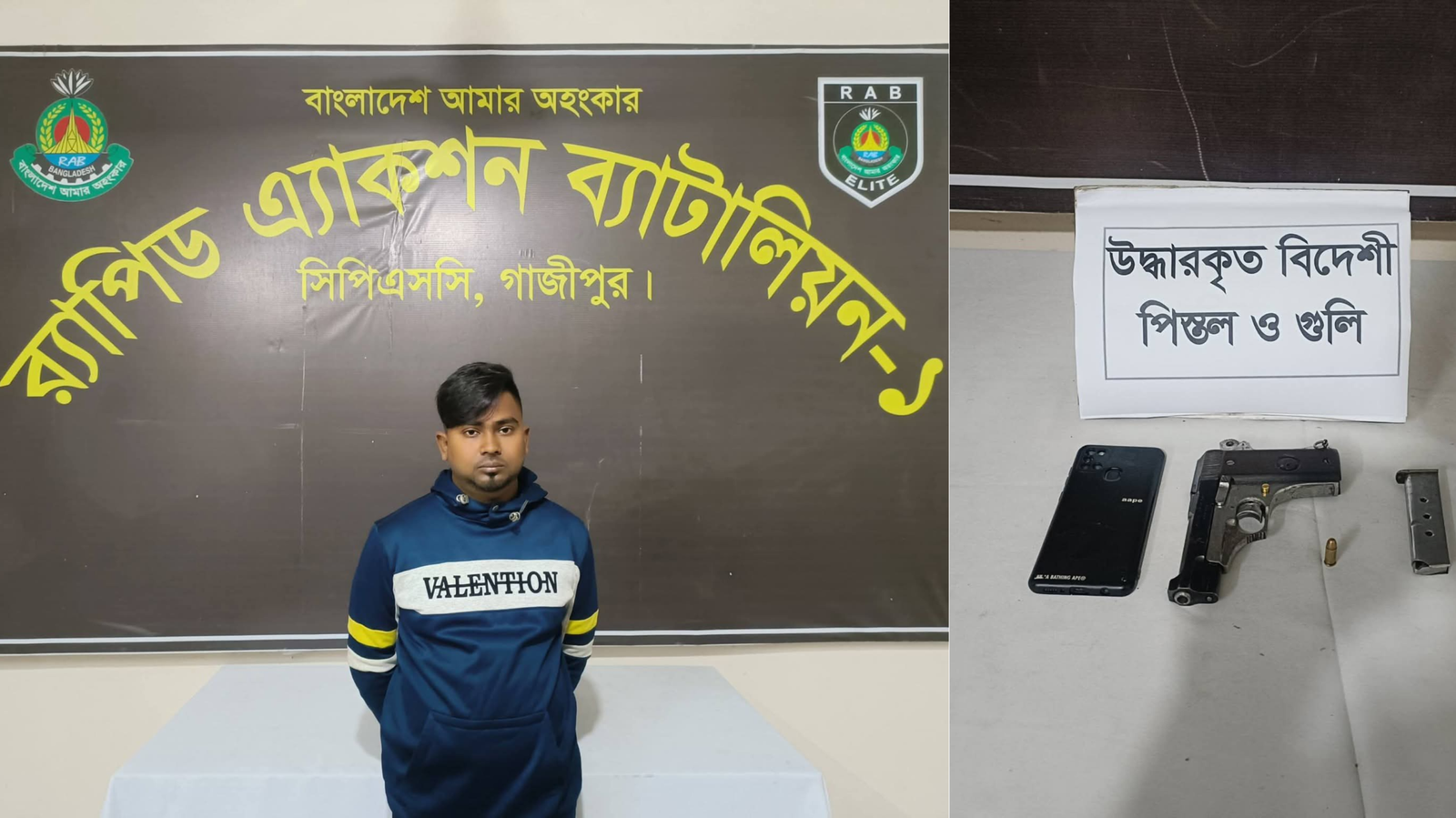 গাজীপুরের শ্রীপুরে মাওনা পিয়ার আলী কলেজ সংলগ্ন এলাকা থেকে যৌথবাহিনী অভিযান চালিয়ে বিদেশি পিস্তল, এক রাউন্ড গুলি ও ম্যাগজিনসহ আকাশ (২৮) নামে এক যুবককে আটক করেছে৷