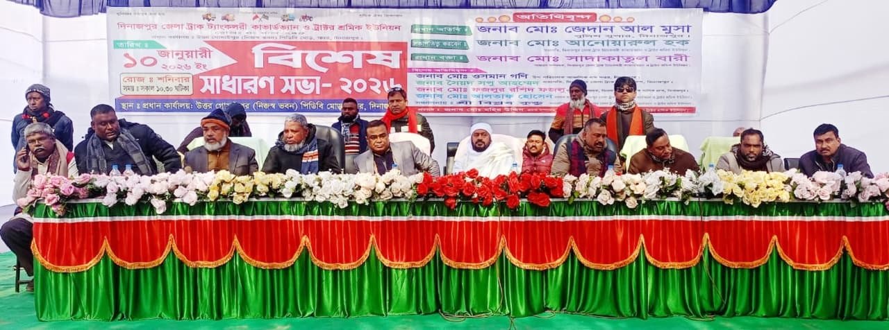 দিনাজপুর জেলা ট্রাক ট্যাংকলরী, কাভার্ডভ্যান ও ট্রাক্টর শ্রমিক ইউনিয়ন (রেজি নং রাজ-২৪৫) এর বিশেষ সাধারণ সভা অনুষ্ঠিত হয়েছে। সভায় মৃত ও পঙ্গু শ্রমিকসহ শ্রমিক পরিবারের মেয়েদের বিবাহের জন্য মোট ১৯ লাখ ৩০ হাজার টাকার এককালীন অনুদানের চেক বিতরণ করা হয়। একই সঙ্গে আসন্ন ত্রয়োদশ জাতীয় সংসদ নির্বাচনকে সামনে রেখে সংগঠনের ‘ত্রি-বার্ষিক নির্বাচন-২০২৬’ পেছানোর সিদ্ধান্ত গৃহীত হয়।