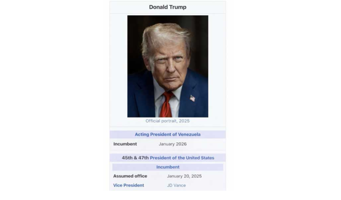 মার্কিন প্রেসিডেন্ট ডোনাল্ড ট্রাম্প সম্প্রতি সোশ্যাল মিডিয়ায় একটি ছবি পোস্ট করে নিজেকে ভেনেজুয়েলার ‘ভারপ্রাপ্ত প্রেসিডেন্ট’ হিসেবে দাবি করেছেন। এই ঘটনাটি ঘটেছে মার্কিন সামরিক বাহিনীর এক বিতর্কিত অভিযানে ভেনেজুয়েলার প্রেসিডেন্ট নিকোলাস মাদুরোকে আটকের মাত্র কয়েক দিন পরই।