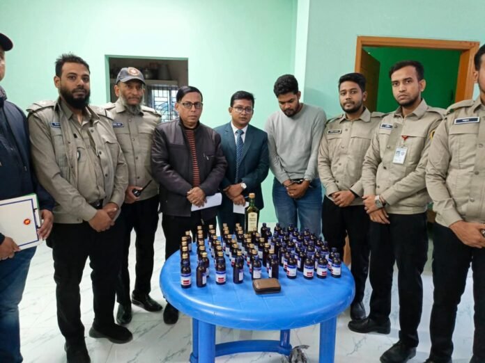 মাদারীপুরের শিবচর উপজেলার উমেদপুর ইউনিয়নের পশ্চিম কাচিকাটা পাল বাড়িতে টাস্কফোর্স অভিযান চালিয়ে ৭০ বোতল ফেনসিডিল ও এক বোতল মদসহ আকাশ পাল (৩৫) নামে এক মাদক কারবারিকে আটক করা হয়েছে। তিনি সমীর পালের ছেলে।