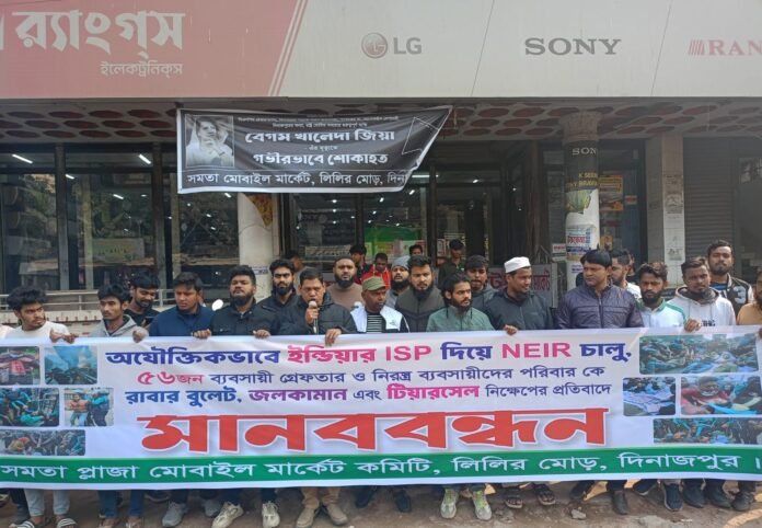 দিনাজপুর শহরের প্রাণকেন্দ্র লিলি মোড়স্থ সমতা প্লাজা মোবাইল মার্কেট কমিটির উদ্যোগে অযৌক্তিকভাবে ভারতের আইএসপি দিয়ে এনইআইআর চালু, ৫৬ জন মোবাইল ব্যবসায়ীকে গ্রেফতার এবং নিরস্ত্র ব্যবসায়ী ও তাদের পরিবারের ওপর রাবার বুলেট, জলকামান ও টিয়ারসেল নিক্ষেপের প্রতিবাদে এ মানববন্ধন কর্মসূচি পালিত হয়েছে।