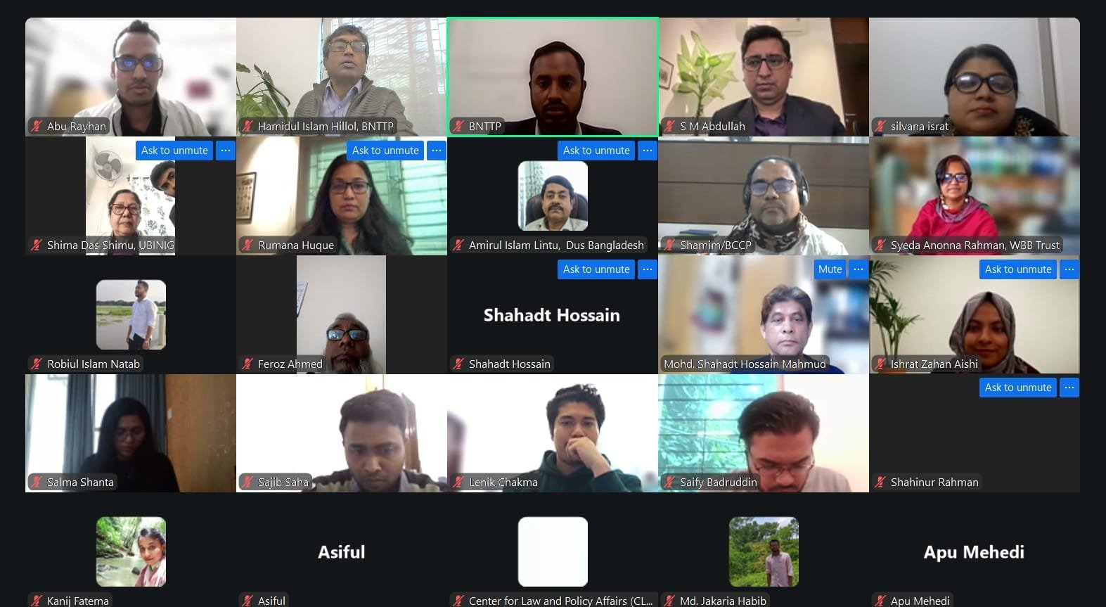 ঢাকা বিশ্ববিদ্যালয়ের অর্থনীতি বিভাগের অধ্যাপক ও বিএনটিটিপির টেকনিক্যাল কমিটির আহ্বায়ক ড. রুমানা হকের সভাপতিত্বে ওয়েবিনারে মূল প্রবন্ধ উপস্থাপন করেন বিএনটিটিপি’র প্রজেক্ট ম্যানেজার হামিদুল ইসলাম হিল্লোল এবং সঞ্চালনা করেন বিএনটিটিপি’র সিনিয়র প্রজেক্ট অ্যান্ড কমিউনিকেশন অফিসার ইব্রাহীম খলিল।