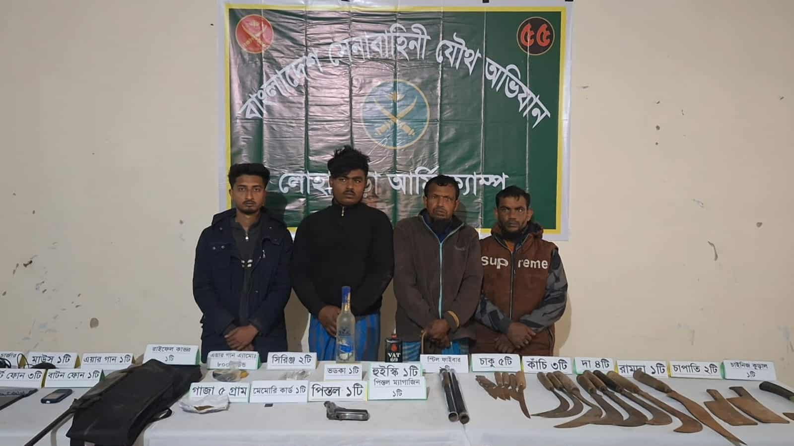 এর আগে গত বুধবার মধ্যরাত থেকে বৃহস্পতিবার সকাল পর্যন্ত উপজেলার দিঘলিয়া ও আগ্রাহাটি এলাকায় অভিযান চালিয়ে অস্ত্রসহ চারজনকে আটক করা হয়। আটকরা হলেন—লোহাগড়া উপজেলার দীঘলিয়া ইউনিয়নের দীঘলিয়া গ্রামের মো. কামরুজ্জামান মণ্ডলের ছেলে তোফায়েল মণ্ডল, একই উপজেলার লাহুড়িয়া ডহরপাড়া গ্রামের তবিবুর বিশ্বাসের ছেলে মো. রাসেল বিশ্বাস, সাতক্ষীরা শ্যামনগর উপজেলার বইশখালী গ্রামের মৃত নূর ইসলাম গাজীর ছেলে ইসমাইল হোসেন ওরফে পিন্টু এবং একই গ্রামের মৃত তোফাজ্জল গাজীর ছেলে আমিনুর গাজী।