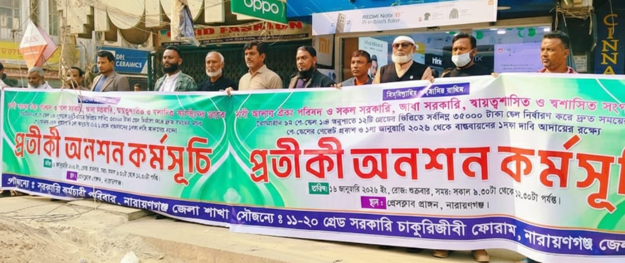 নারায়ণগঞ্জে সরকারি কর্মচারী পরিবার ও ১১–২০ গ্রেড সরকারি চাকুরিজীবি ফোরামের জেলা শাখার উদ্যোগে নবম পে-স্কেল বাস্তবায়নের দাবিতে শুক্রবার (১৬ জানুয়ারি) প্রতীকী অনশন কর্মসূচি পালন করা হয়েছে। নারায়ণগঞ্জ প্রেসক্লাবের সামনে অনুষ্ঠিত এই কর্মসূচিতে সভাপতিত্ব করেন সরকারি কর্মচারী জেলা শাখার সভাপতি শফিউল কাদের সাউদ।