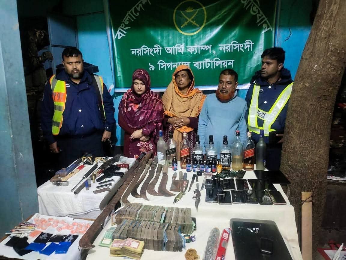 উদ্ধারকৃত মালামাল – ১ টি আগ্নেয়াস্ত্র (সাথে ২টি কার্তুজ), ৩টি পিস্তল ম্যাগাজিন, ১৬শ পিস ইয়াবা ট্যাবলেট, নগদ ১৫,৪০,১০০ টাকা, মোবাইল ১৭ টি (১৩টি স্মার্টফোন, ৪টি বাটন), ২টি সামুরাই, ৬টি ফেন্সিডিল, ৯টি বিদেশি মদের বোতল, ২টি নকল পিস্তল, ২টি রাম দা ও ১টি ল্যাপটপ।