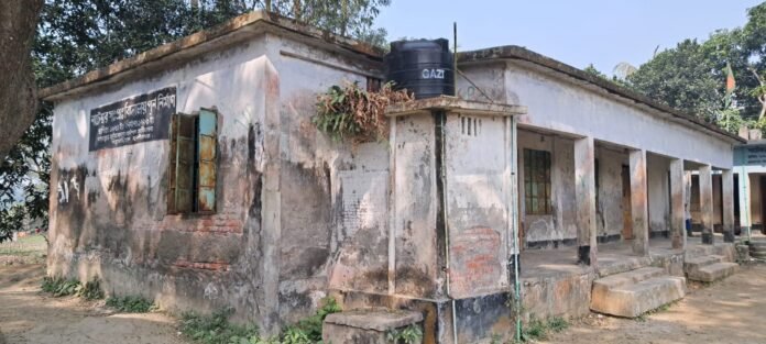 ভবনের পলেস্তরা খুলে পড়ছে অন্তত সাত বছর থেকে। চাপে বাঁকা হয়ে গেছে জানালা-দরজা। খুলেও গেছে কয়েকটা। সেই ভবনেই ঝুঁকি নিয়ে শিক্ষার্থীদের চলত পাঠদান।