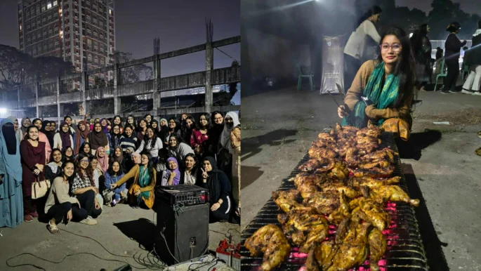 ঢাকা বিশ্ববিদ্যালয়ে রোববার সন্ধ্যায় নারী শিক্ষার্থীদের ওপর আরোপিত বিধিনিষেধ ও বৈষম্যের প্রতিবাদে কেন্দ্রীয় খেলার মাঠে ‘প্রশাসন পোড়াও বারবিকিউ’ কর্মসূচি পালন করেছেন একদল ছাত্রী।
