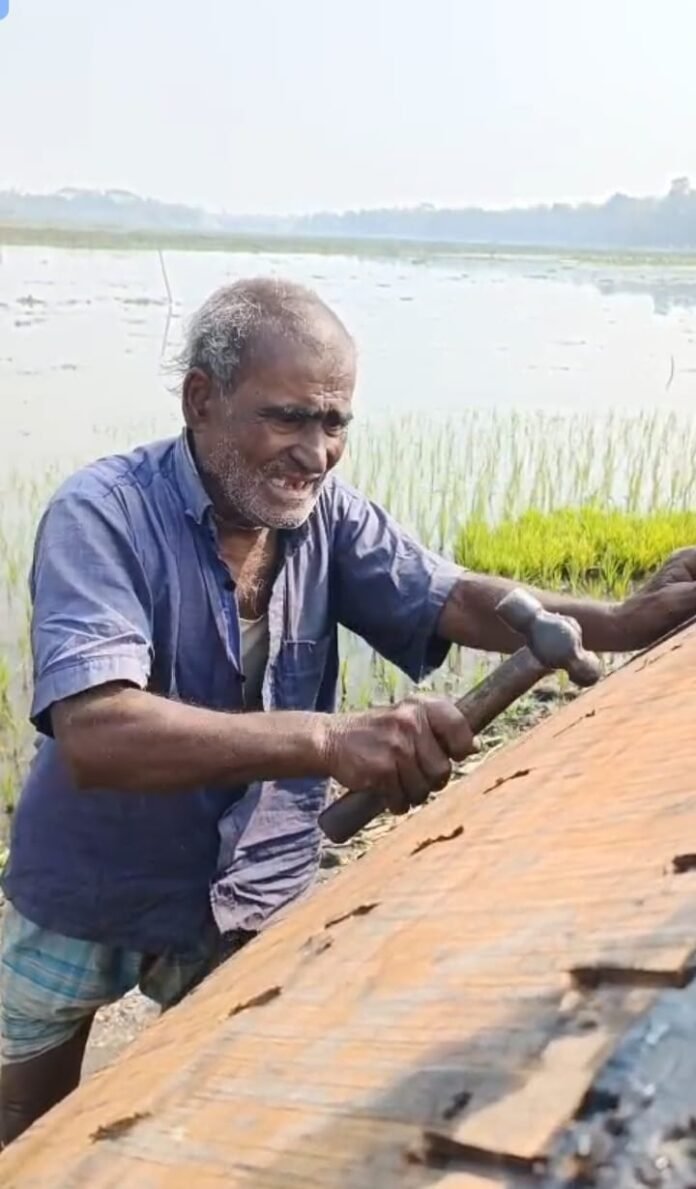 নিপুণ হাতে টুকটাক ঠুকঠাক করে নাও সারাইয়ের কাজ করে চলেছেন তিনি। পাশে আরেকটি নাও—উপোড় করা, আলকতরা মাখা—সেটিও তাঁর হাতেই সারাই হয়েছে। শুধু এখানেই নয়, আশপাশের ১০–২০ গ্রামেও ডাক পড়ে পরিমল সূত্রধরের নাও মেরামতির কাজে।