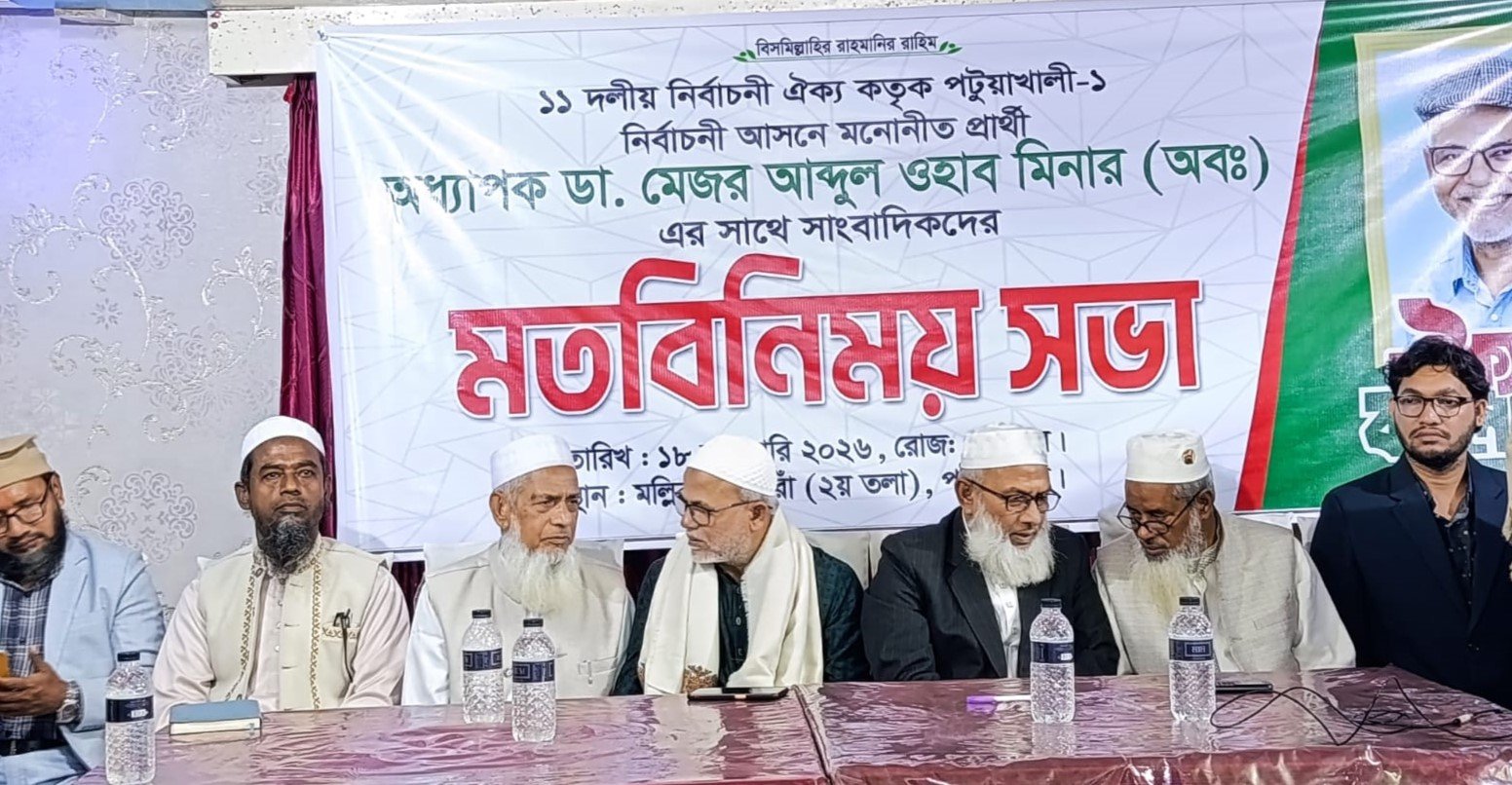 পটুয়াখালী-১ আসনে ১১ দলীয় নির্বাচনী ঐক্যের মনোনীত প্রার্থী অধ্যাপক ডা. আব্দুল ওহাব মিনার (অব.)–এর সঙ্গে সাংবাদিকদের এক মতবিনিময় সভা অনুষ্ঠিত হয়েছে।
