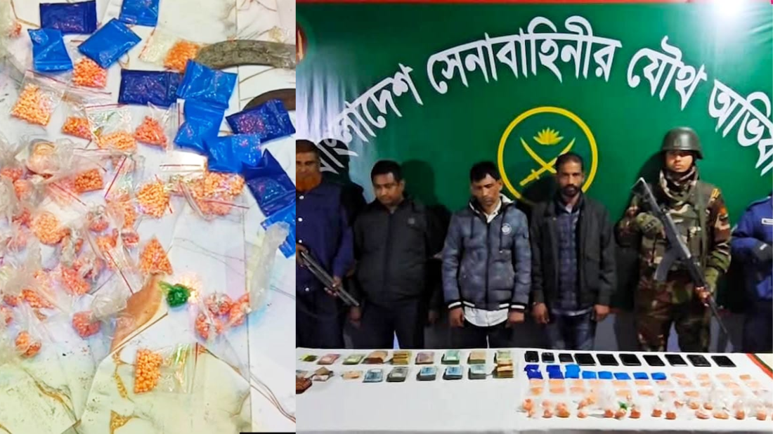 আজ মঙ্গলবার রাত আনুমানিক ১টা ৩০ মিনিট থেকে যৌথবাহিনী ওই এলাকায় অভিযান শুরু করে। অভিযান চলাকালে একটি বাসায় তল্লাশি চালিয়ে ৭ হাজার ৪১ পিস ইয়াবা, নগদ তিন লক্ষ টাকা এবং ১০টি মোবাইল ফোন উদ্ধার করা হয়।