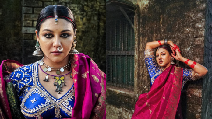 ছবিগুলোতে দেখা যায়, নীল রঙের সূক্ষ্ম কারুকাজ করা ব্লাউজের সঙ্গে গাঢ় গোলাপি পাড়ের শাড়িতে লাস্যময়ী হয়ে উঠেছেন তিনি। শাড়ির রঙ ও নকশার সঙ্গে মানানসই ভারী গয়না, নাকে বড় নথ এবং কপালে টিকলি জয়ার সাজকে দিয়েছে রাজকীয় আবহ। এই লুকের মাধ্যমে যেন তিনি ফিরে গেছেন এক অন্য সময়ের সৌন্দর্যে—যেখানে আভিজাত্য আর ঐতিহ্য ছিল নারীর অলংকার।