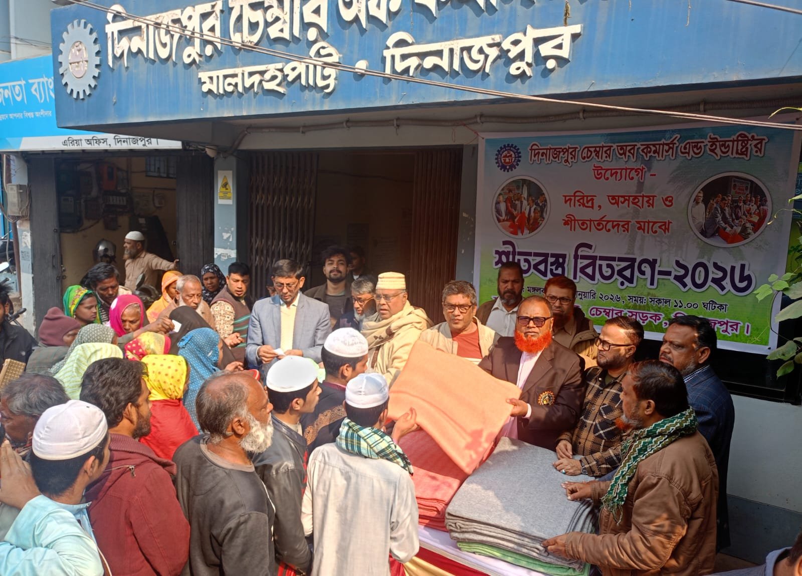 দিনাজপুর চেম্বার অব কমার্স এন্ড ইন্ডাস্ট্রির আয়োজনে প্রতিবছরের ন্যায় এবারও দরিদ্র, অসহায় ও শীতার্তদের মাঝে শীতবস্ত্র বিতরণ -২০২৬ কর্মসূচির উদ্বোধন করা হয়েছে ।
