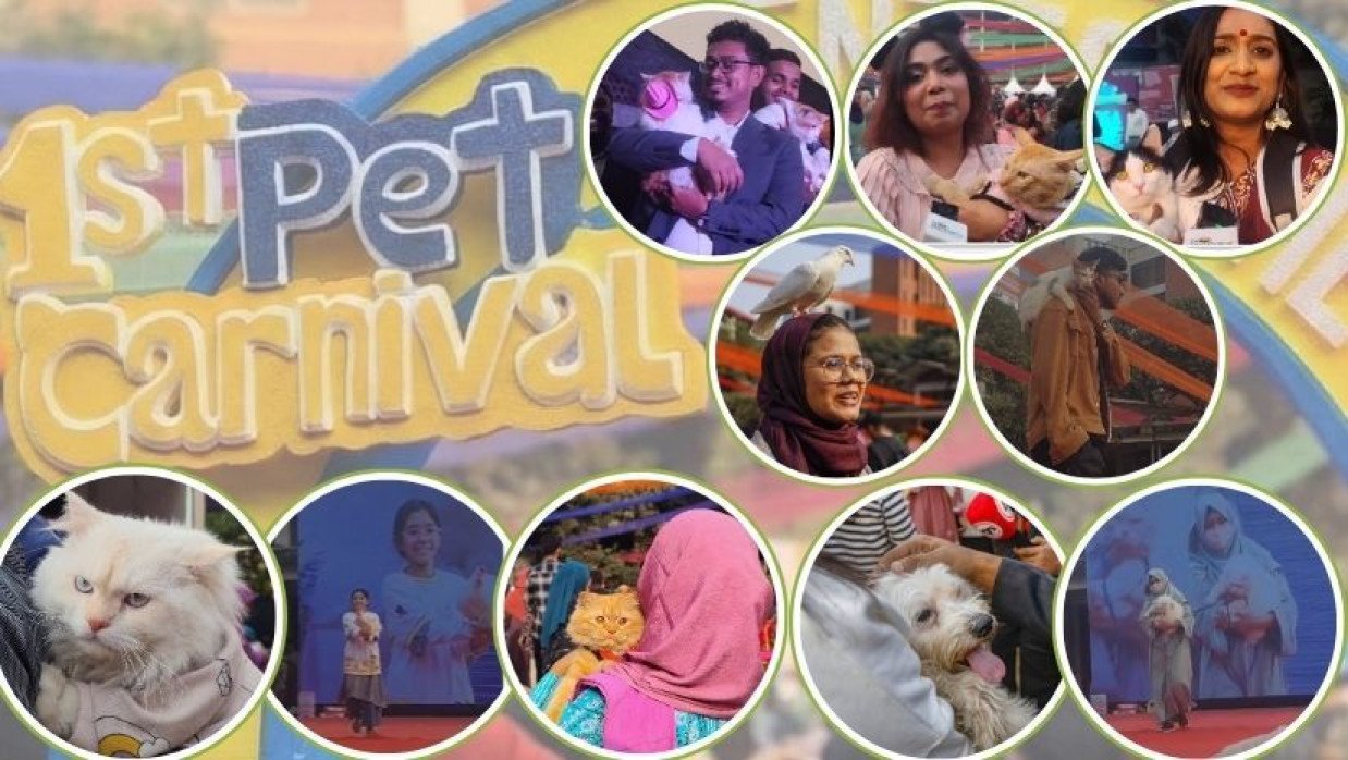 ঢাকা বিশ্ববিদ্যালয় (ঢাবি) ক্যাম্পাসে প্রথমবারের মতো ভিন্নধর্মী এক উৎসবে মেতেছিলেন প্রাণীপ্রেমীরা। কারো গায়ে ছোট জ্যাকেট বা ব্লেজার, কারো চোখে রঙিন সানগ্লাস কিংবা গলায় পুঁতির মালা—এমনই সব বিচিত্র ও বর্ণিল সাজে রেড কার্পেটে হেঁটেছে বিড়াল, কুকুর ও কবুতরের মতো পোষা প্রাণীরা। মঙ্গলবার (২০ জানুয়ারি) বিকেলে টিএসসি প্রাঙ্গণে আয়োজিত এই ‘প্রথম পেট কার্নিভাল’ নজর কেড়েছে শিক্ষক-শিক্ষার্থীসহ দর্শনার্থীদের।