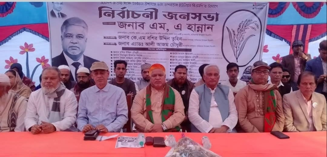আসন্ন ত্রয়োদশ জাতীয় সংসদ নির্বাচনকে সামনে রেখে ব্রাহ্মণবাড়িয়া জেলার নাসিরনগর উপজেলার চাপরতলা ইউনিয়নে ধানের শীষ প্রতীকে এম এ হান্নানের নির্বাচনি জনসভা অনুষ্ঠিত হয়েছে।