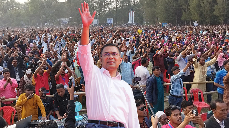 বিএনপি চেয়ারম্যান তারেক রহমান বলেছেন, ‘একটি গোষ্ঠী তারা আবার ষড়যন্ত্র করছে যেন নির্বাচন বাধাগ্রস্ত হয়। এই ব্যাপারে আপনাদের সকলকে সচেতন থাকতে হবে। ১২ তারিখে ইনশাআল্লাহ, এখানে যারা মুসলমান ভাই আছেন আপনারা তাহাজ্জুদ পড়ে স্ব স্ব নির্বাচনী এলাকায় স্ব স্ব ভোট কেন্দ্রে গিয়ে ভোরে ফজরের জামাত ওখানে ভোট কেন্দ্রের সামনে আদায় করবেন।