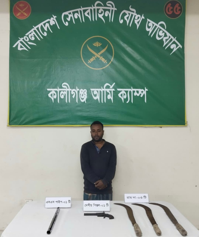 এ সময় হাবিবুরের নিজ বাসস্থানের সামনে রাখা ধানের গোলার ভিতর থেকে একটি দেশীয় আগ্নেয়াস্ত্র এবং বাসস্থানের ভেতর থেকে বিভিন্ন দেশীয় ধারালো অস্ত্র উদ্ধার করা হয়। পরে হাবিবুর রহমানকে শ্যামনগর থানায় হস্তান্তর করা হয়েছে বলে জানায় কালিগঞ্জ সেনা ক্যাম্প।