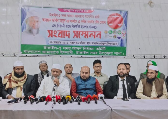 বুধবার (২৮ জানুয়ারি) দুপুরে টাঙ্গাইল প্রেসক্লাবে এ সংবাদ সম্মেলন করা হয়। এ সময় জেলার বিভিন্ন আসনে জামায়াতে ইসলামীর নারী ও পুরুষ কর্মীদের উপর হামলার অভিযোগ করেন ১১ দলের প্রার্থী জেলা জামায়াতে ইসলামীর আমীর আহছান হাবীব মাসুদ।