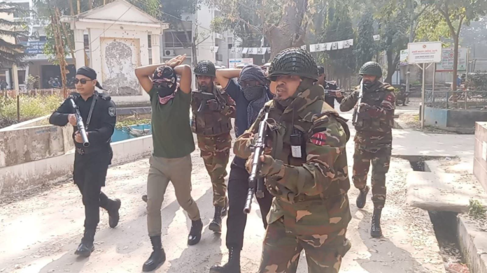 জয়পুরহাট সদর উপজেলা নির্বাহী কর্মকর্তা (ইউএনও) আশিক-উর রহমানকে তাঁর কার্যালয়ে ঢুকে দুই দুর্বৃত্ত জিম্মি করেছে—এমন চাঞ্চল্যকর পরিস্থিতির সৃষ্টি হয় বুধবার দুপুরে। খবর পেয়ে দ্রুত ঘটনাস্থলে ছুটে আসেন সেনাবাহিনী, বিজিবি, র্যাব ও পুলিশের সদস্যরা। পরে কমান্ডো কায়দায় অভিযানে নেমে দুই দুর্বৃত্তকে আটক এবং ইউএনওকে অক্ষত অবস্থায় উদ্ধার করা হয়। ঘটনাটি বাস্তব নয়। আগামী ১২ ফেব্রুয়ারি অনুষ্ঠিতব্য জাতীয় সংসদ নির্বাচন সামনে রেখে আইনশৃঙ্খলা পরিস্থিতি স্বাভাবিক রাখতে যৌথ বাহিনীর একটি মহড়ার অংশ ছিল পুরো দৃশ্যটি।