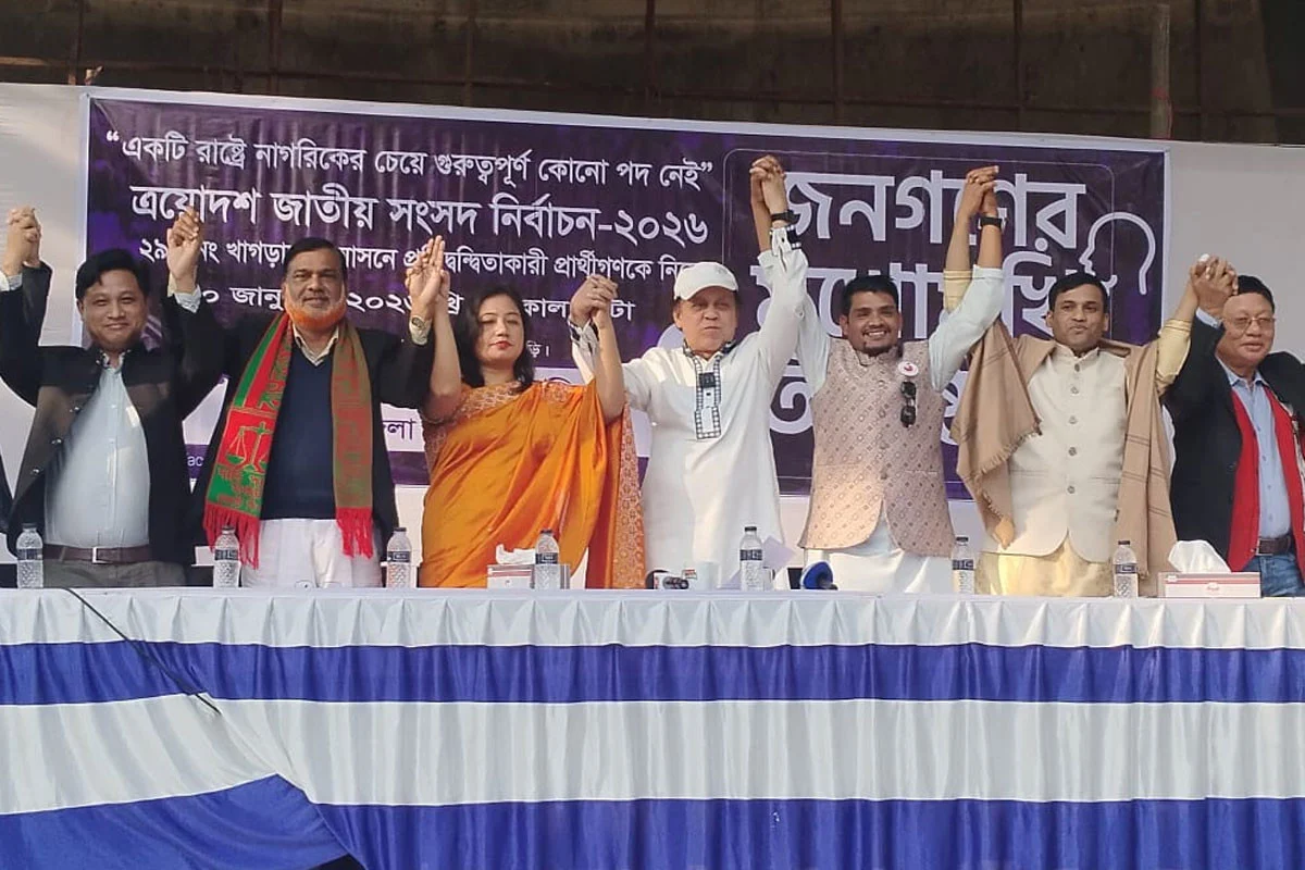 খাগড়াছড়িতে সুশাসন প্রতিষ্ঠার লক্ষ্যে সংসদ সদস্য পদে প্রতিদ্বন্দ্বী প্রার্থীদের নিয়ে ‘জনতার মুখোমুখি’ অনুষ্ঠান অনুষ্ঠিত হয়েছে। ১১ জন প্রার্থীর মধ্যে ১০ জন এতে অংশ নেন।