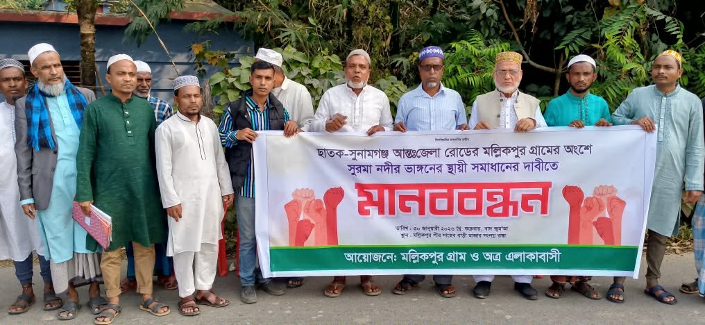 সুরমা নদীর তীব্র ভাঙনের হাত থেকে ছাতকের মল্লিকপুর ও আশপাশের এলাকা রক্ষায় দ্রুত কার্যকর ও স্থায়ী ব্যবস্থা গ্রহণের দাবীতে মানববন্ধন কর্মসূচি পালন করেছেন স্থানীয় বাসিন্দারা।