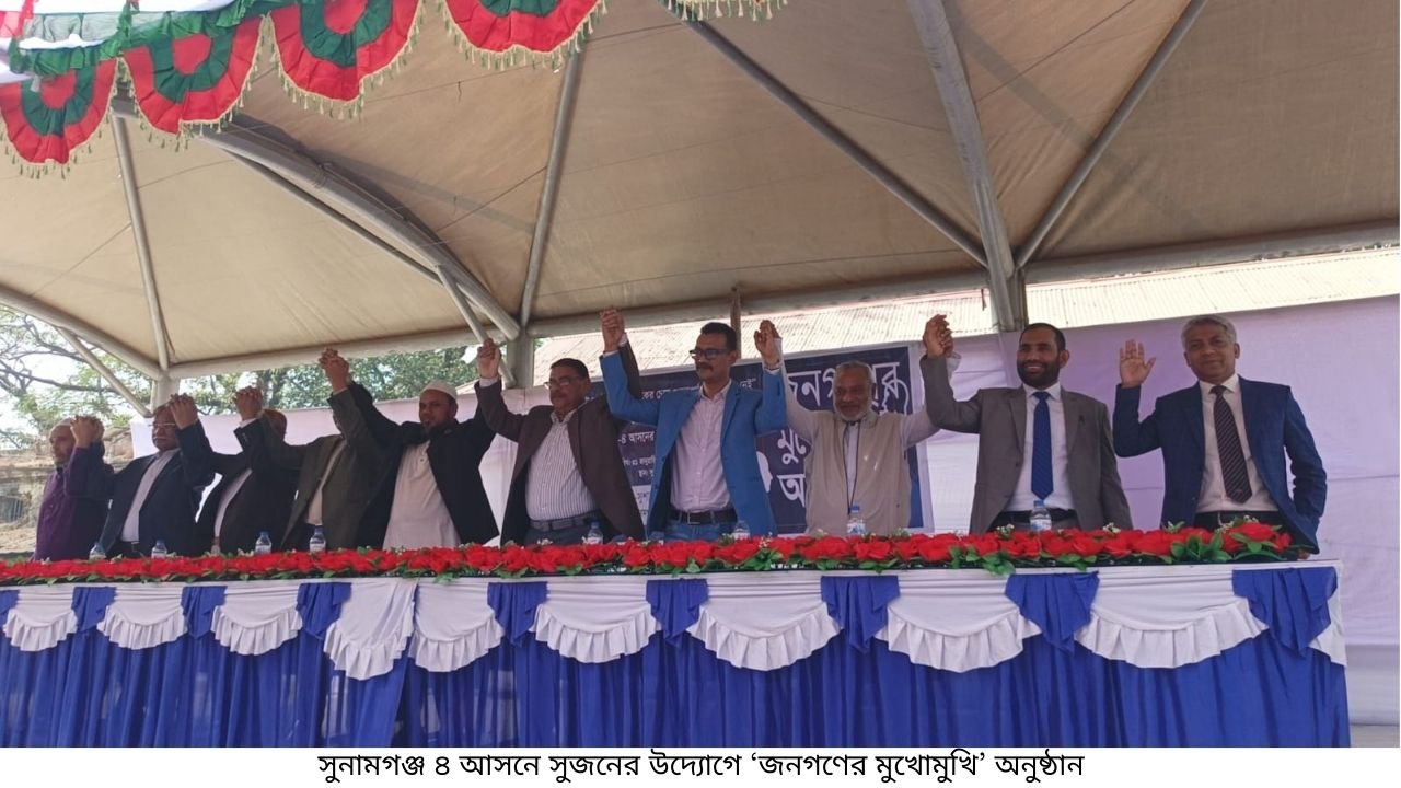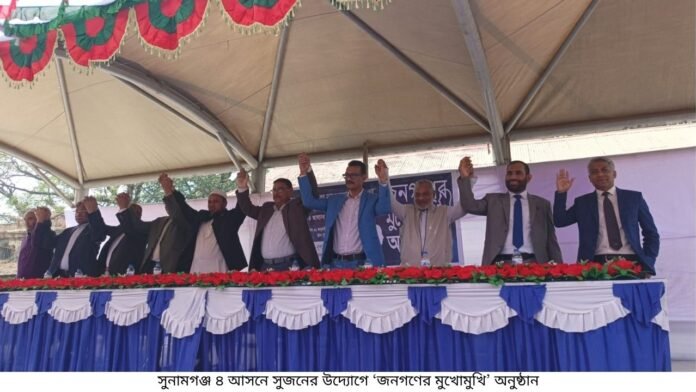 ত্রয়োদশ জাতীয় সংসদ নির্বাচন উপলক্ষে ‘রাষ্ট্রে নাগরিকের চেয়ে গুরুত্বপূর্ণ পদ নেই’ শিরোনামে সুনামগঞ্জ-৪ আসনের প্রতিদ্বন্দ্বী প্রার্থীদের নিয়ে জনগণের মুখোমুখি অনুষ্ঠানে এসব কথা বলেন প্রতিদ্বন্দ্বী প্রার্থীরা।