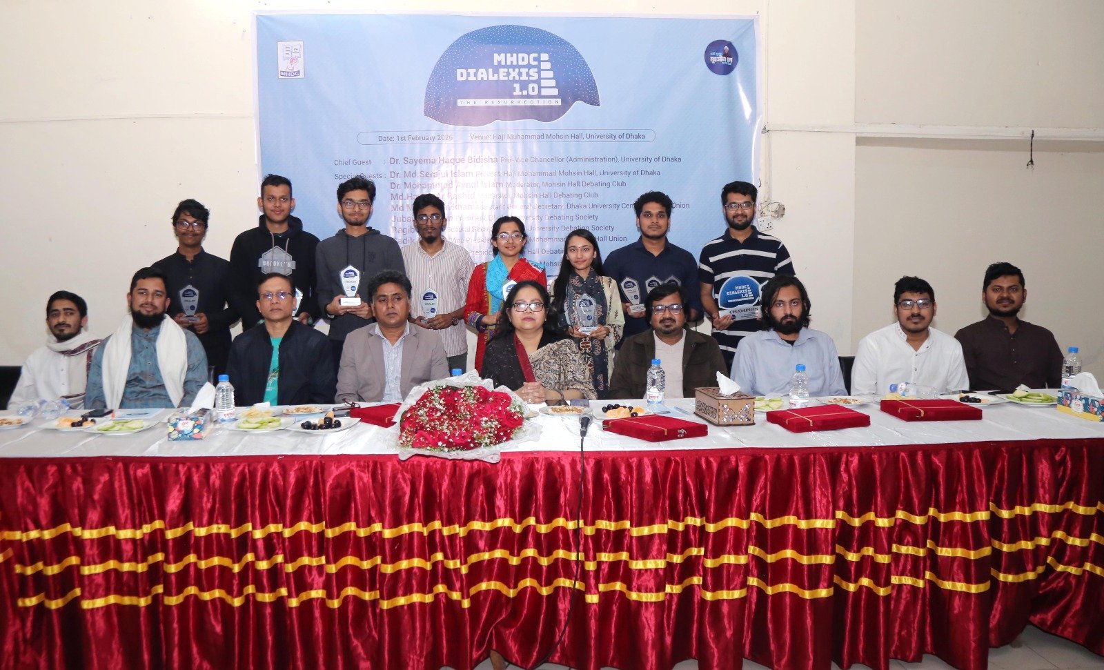ঢাকা বিশ্ববিদ্যালয় হাজী মুহম্মদ মুহসীন হল ডিবেটিং ক্লাব আয়োজিত ‘ MHDC DIALEXIS 1.0 ’ শীর্ষক বিতর্ক প্রতিযোগিতায় ‘স্বাস্থ্য অর্থনীতি ইনস্টিটিউট ডিবেটিং ক্লাব’ চ্যাম্পিয়ন হয়েছে। ডিবেটার অব দ্যা ফাইনাল এবং ডিবেটার অব দ্যা টুর্নামেন্ট হওয়ার গৌরব অর্জন করেছেন স্বাস্থ্য অর্থনীতি ইনস্টিটিউট ডিবেটিং ক্লাবের রিদওয়ান মুহসীন। প্রতিযোগিতার অন্য ফাইনালিস্ট ক্লাবগুলো হল- এথেনিয়াম ডিবেট ফোরাম (এডিএফ), বিতর্ক -একটি তার্কিক সংগঠন (বিইটিএস) ও শহীদুল্লাহ্ হল ডিবেটিং ক্লাব (এসএইচডিসি)। ঢাকা বিশ্ববিদ্যালয়ের উপাচার্যের রুটিন দায়িত্বে নিয়োজিত প্রো-ভাইস চ্যান্সেলর (প্রশাসন) অধ্যাপক ড. সায়মা হক বিদিশা গতকাল ১ ফেব্রুয়ারি ২০২৬ রবিবার সন্ধ্যায় হাজী মুহম্মদ মুহসীন হল মিলনায়তনে সমাপনী অনুষ্ঠানে প্রধান অতিথি হিসেবে উপস্থিত থেকে বিজয়ীদের মাঝে পুরস্কার বিতরণ করেন।
