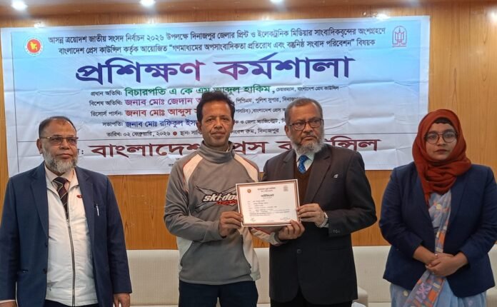 দিনাজপুর জেলা প্রশাসনের সহযোগিতায় আসন্ন ত্রয়োদশ জাতীয় সংসদ নির্বাচন -২০২৬ উপলক্ষে দিনাজপুর জেলার প্রিন্ট ও ইলেকট্রনিক মিডিয়ার সাংবাদিকবৃন্দের অংশগ্রহণে বাংলাদেশ প্রেস কাউন্সিল কর্তৃক আয়োজিত “গণমাধ্যমের অপসাংবাদিকতা প্রতিরোধ এবং বস্তুনিষ্ঠ সংবাদ পরিবেশন” বিষয়ক প্রশিক্ষণ কর্মশালা অনুষ্ঠিত হয়েছে।