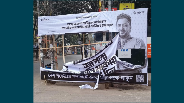 ঢাকা-১১ আসনে গণসমর্থনে আতঙ্কিত হয়ে মাফিয়া গোষ্ঠী পরিকল্পিতভাবে ব্যানার ও বিলবোর্ড ছিঁড়ে ফেলছে বলে অভিযোগ করেছেন ১১ দলীয় জোট মনোনীত প্রার্থী এবং জাতীয় নাগরিক পার্টির (এনসিপি) আহ্বায়ক নাহিদ ইসলাম। সোমবার (২ ফেব্রুয়ারি) নিজের ভেরিফাইড ফেসবুক পেজে দেওয়া এক পোস্টে তিনি এই অভিযোগ করেন।