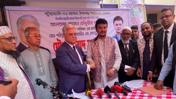সোমবার শেরে বাংলা সড়কস্থ সুরাইয়া ভিলায় বিএনপি মনোনীত প্রার্থী এয়ার ভাইস মার্শাল (অব.) আলতাফ হোসেন চৌধুরীর উপস্থিতিতে যৌথ সংবাদ সম্মেলনে আনুষ্ঠানিকভাবে পটুয়াখালী-১ আসনে ধানের শীষের পক্ষে সমর্থন ও একসাথে কাজ করার ঘোষণা করেন।