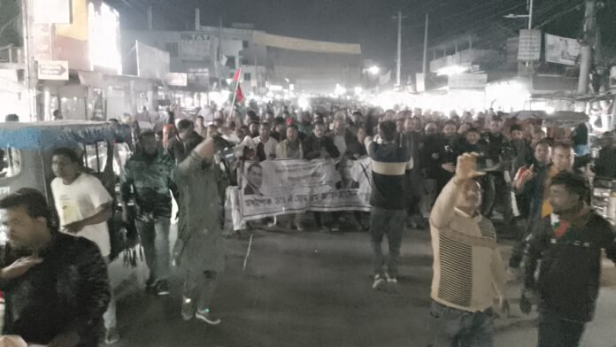 সোমবার (২ ফেব্রুয়ারি) সন্ধ্যা ৬টার দিকে উপজেলার রাণীগঞ্জ হাই স্কুল মাঠের সামনে থেকে মিছিলটি শুরু হয়। পরে মিছিলটি দিনাজপুর–গোবিন্দগঞ্জ আঞ্চলিক মহাসড়ক প্রদক্ষিণ করে পুনরায় একই স্থানে এসে শেষ হয়।