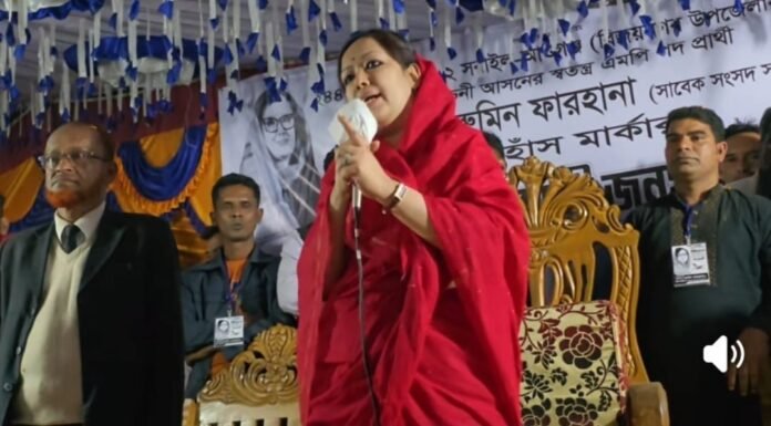 ব্রাহ্মণবাড়িয়া-২ আসন (সরাইল–আশুগঞ্জ ও বিজয়নগরের দুই ইউনিয়ন) থেকে স্বতন্ত্র সাংসদ প্রার্থী ও বিএনপির বহিষ্কৃত সহ-আন্তর্জাতিক বিষয়ক সম্পাদক ব্যারিস্টার রুমিন ফারহানা দিনভর নির্বাচনী প্রচারণায় ব্যস্ত সময় পার করেছেন সরাইল উপজেলার অরুয়াইল ইউনিয়নে।