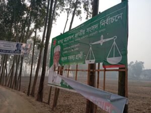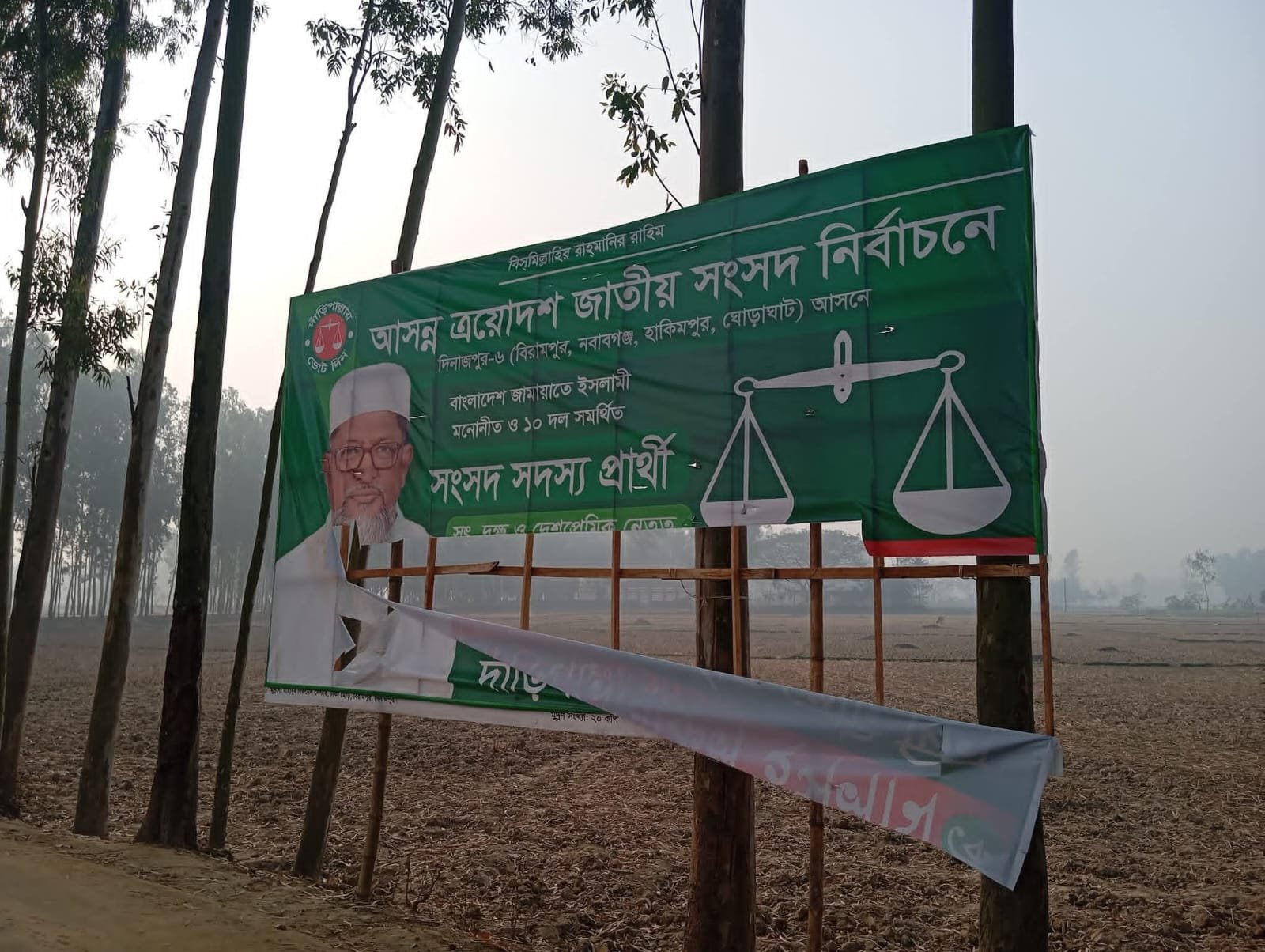দিনাজপুর–৬ আসনে জামায়াতের মনোনীত সংসদ সদস্য প্রার্থী আনোয়ারুল ইসলামের দাঁড়িপাল্লা প্রতীকের ছেঁড়া বিলবোর্ড।