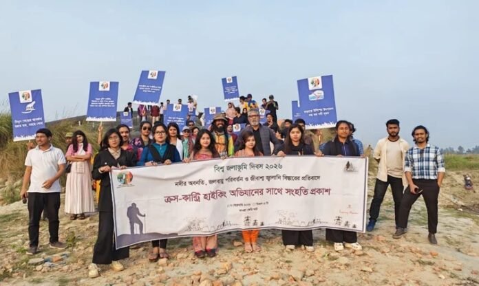 জলবায়ু পরিবর্তনের প্রভাব মোকাবেলায় ‘নদীতে প্রাণের কান্না: বৈশ্বিক উষ্ণতার বিরুদ্ধে দাঁড়াও’ শীর্ষক ক্রস-কান্ট্রি হাইকিং অভিযানে সংহতি জানিয়ে বিশ্ব জলাভূমি দিবস ২০২৬ উপলক্ষে পদ্মা নদীর পাড়ে নাগরিক সংহতি সমাবেশ অনুষ্ঠিত হয়েছে। নদী অবনতি, জলবায়ু পরিবর্তন এবং জীবাশ্ম জ্বালানি বিস্তারের প্রতিবাদে এর আয়োজন করা হয়।