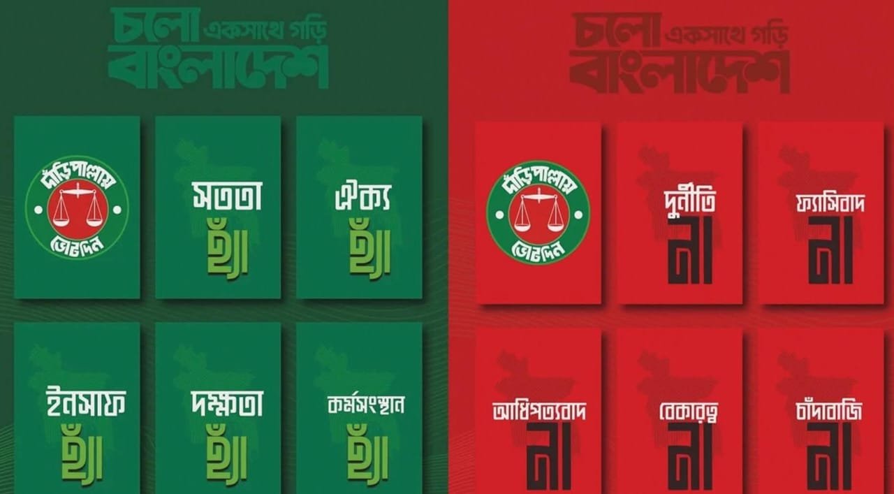 সরেজমিন দেখা গেছে, ইশতেহার ঘোষণার মঞ্চও সাজানো হয়েছে এই ‘হ্যাঁ-না’ ভাবনাকে কেন্দ্র করে। মঞ্চের নকশা ও ভিজ্যুয়াল উপস্থাপনায় ইশতেহারের এই মূল দর্শন প্রতিফলিত করা হয়েছে, যা দলটির রাজনৈতিক বার্তাকে আরও প্রতীকী ও দৃশ্যমান করে তুলবে বলে মনে করছেন সংশ্লিষ্টরা।