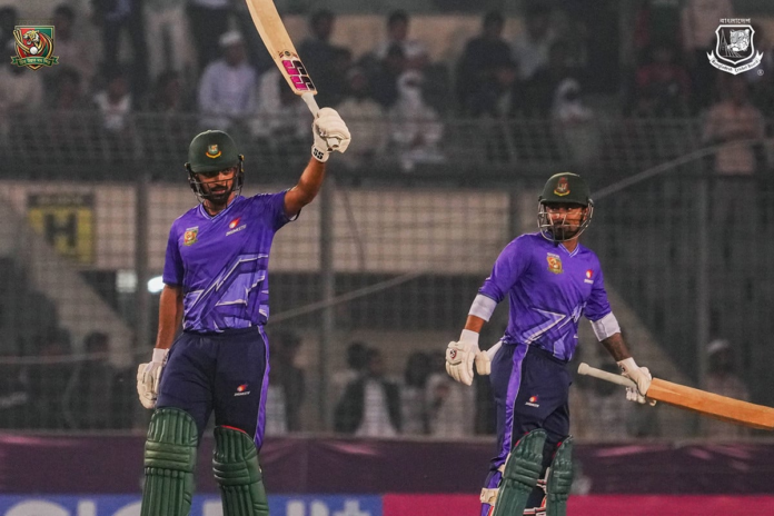 তিন নম্বরে নেমে ম্যাচের নিয়ন্ত্রণ পুরোপুরি নিজের হাতে তুলে নেন লিটন কুমার দাস। দারুণ টাইমিং ও নিখুঁত শট নির্বাচনে ৪৩ বলে ১০টি চার হাঁকিয়ে অপরাজিত ৬৫ রান করেন জাতীয় দলের এই উইকেটকিপার ব্যাটার। অপর প্রান্তে পারভেজ হোসেন ইমন (৬), তাওহীদ হৃদয় (২) দ্রুত ফিরলেও জয়ে কোনো প্রভাব পড়েনি।