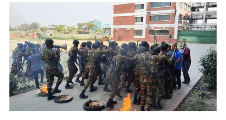 বৃহস্পতিবার কালিগঞ্জ সেনা ক্যাম্পে আয়োজিত মহড়ায় দেখানো হয়, সন্ত্রাসী পরিস্থিতিতে সেনাবাহিনীর দক্ষ সদস্যরা কীভাবে দ্রুত ও পরিকল্পিত অভিযানের মাধ্যমে ভোটকেন্দ্র দখলমুক্ত করেন এবং নিরাপদে জিম্মি প্রিজাইডিং অফিসারকে উদ্ধার করেন। পুরো কার্যক্রমটি ছিল কৌশলগত দক্ষতা ও সময়োপযোগী পদক্ষেপে পরিপূর্ণ।