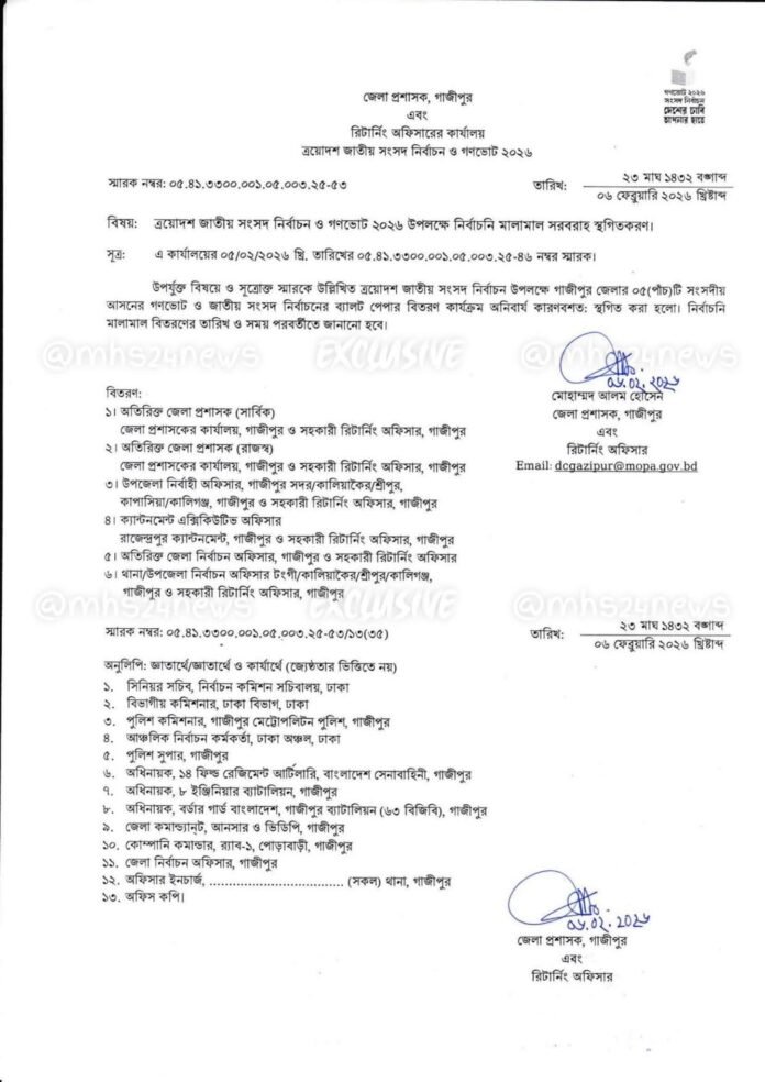 চিঠিতে উল্লেখ করা হয়েছে, ‘গাজীপুর জেলার পাঁচটি সংসদীয় আসনের গণভোট ও জাতীয় সংসদ নির্বাচনের ব্যালট পেপার বিতরণ কার্যক্রম ‘অনিবার্য কারণবশত’ স্থগিত করা হয়েছে। নির্বাচনী মালপত্র বিতরণের নতুন তারিখ ও সময় পরবর্তীতে জানানো হবে।